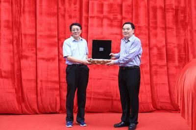 包信和校长代表学校向郭庶英女士、严慧英女士和华光先生赠送了“孺子牛”瓷盘。