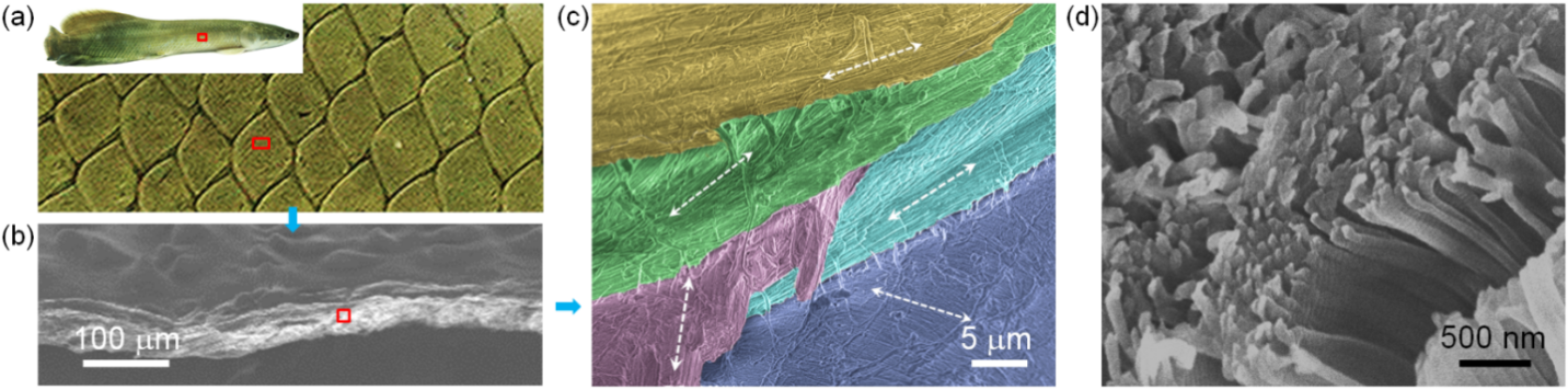 图一:“巨骨舌鱼”鳞片多尺度结构。(a)“巨骨舌鱼”及其鳞片数码照片;(b)扫描电子显微镜下的鳞片截面,其中灰黑色部分(上)为鳞片高度矿化的硬质外壳层,趋于白色的区域为内纤维层;(c)内纤维层的局部放大,显示了扭曲偏转排布的纤维层(标注不同颜色的区域和白色虚箭头指示着不同取向的纤维薄片);(d)单一取向纤维层进一步放大,显示了高度有序的胶原纳米纤维。