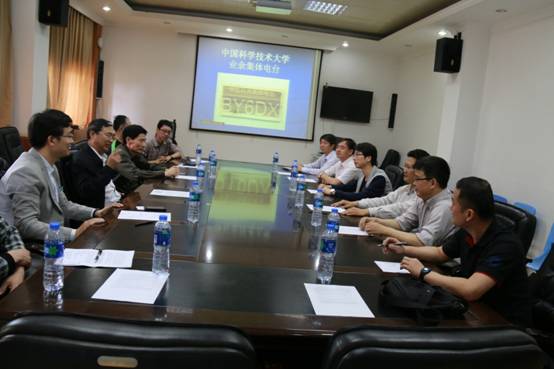 在电二楼会议室,参加活动的各位领导与协会师生进行了简短的座谈与交流。协会指导老师贺博向客人们介绍了协会的发展历程和本次活动的主要内容。中国科大无线电协会有着悠久的历史,曾多次在全国性和世界性的大赛中取得骄人成绩,在日常活动过程中也出现了许多非常感人的事迹。省经信委曹晓武副主任充分肯定了科大无线电协会这些年来所取得的成就,强调无线电协会在科学普及、应急救灾、人才培养等方面具有重要作用。他指出,科大在这方面的工作已经起到了比较好的示范作用,省里也会一如既往地予以更多的支持和服务,希望校无线电协会的工作能够更上一层楼。
