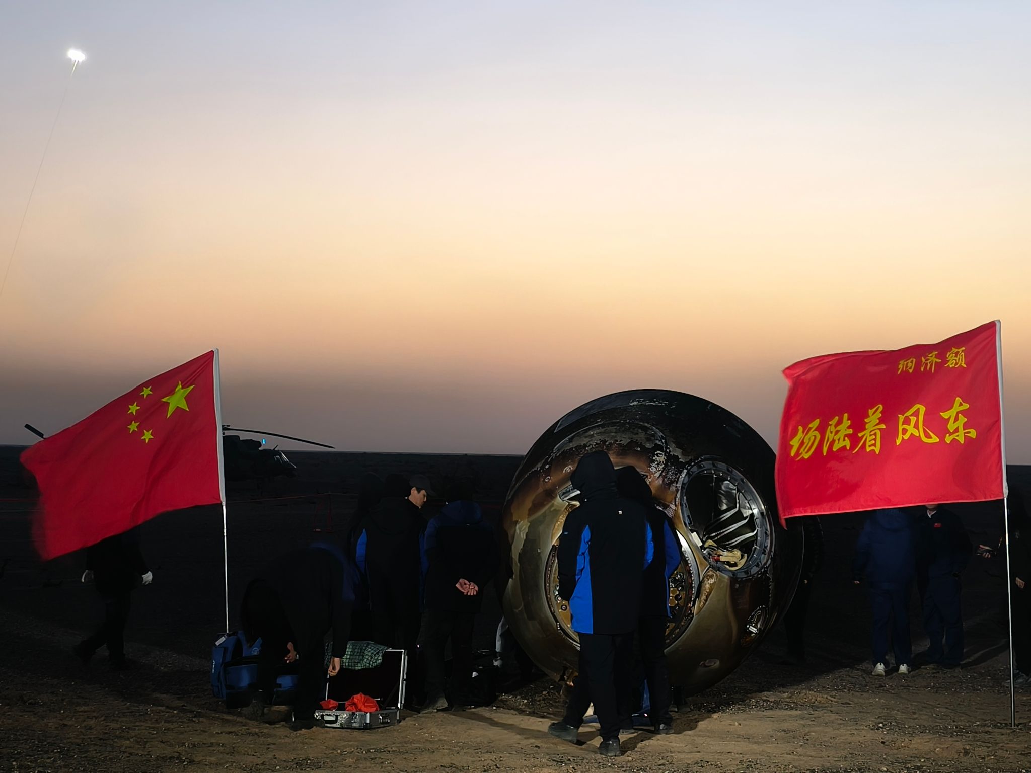 16时40分,神舟二十号航天员乘组乘坐的神舟二十一号载人飞船返回舱在东风着陆场成功着陆。在场人员无不欢呼雀跃地奔向观礼区,鲜艳的五星红旗飘扬在戈壁,与褐色的返回舱一起组成了最美的风景。返回舱舱门打开后,神舟二十号航天员陈冬、陈中瑞、王杰安全顺利出舱,健康状态良好。在现场的掌声和欢呼声中,三名航天员挥手致意,分别进入医监医保车,随后当晚乘机返回北京。在中心领导的关心下,任远和张子昂同学被选中参加了返回舱的护送回京任务,乘坐伊尔76运输机顺利将返回舱交到研究人员手中。至此,师生们亲眼见证了从火箭发射到飞船返回的全过程,真切触摸到祖国航天事业跳动的强劲脉搏。