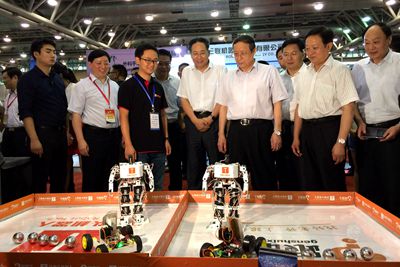7月22日下午,安徽省委书记王学军、代省长李锦斌来到安徽国际会展中心,观摩第19届RoboCup机器人世界杯赛。比赛结束后,王学军一行视察了参赛及参展的各类机器人产品,其中不仅有科大讯飞等著名企业的产品,而且还有来自我校学生创业团队“铁榔头教育科技有限公司”的最新科技项目。