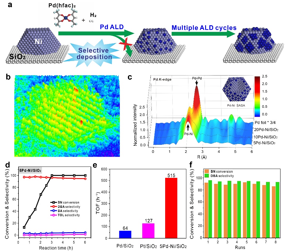 图1,Pd1Ni SASA 催化剂制备、表征和催化性能测试。(a)区域选择性沉积示意图;(b)Pd1Ni SASA样品的电镜表征;(c)不同Pd分散度样品的EXAFS表征(d-f)Pd1Ni SASA样品催化苯甲腈选择性加氢的反应性能。