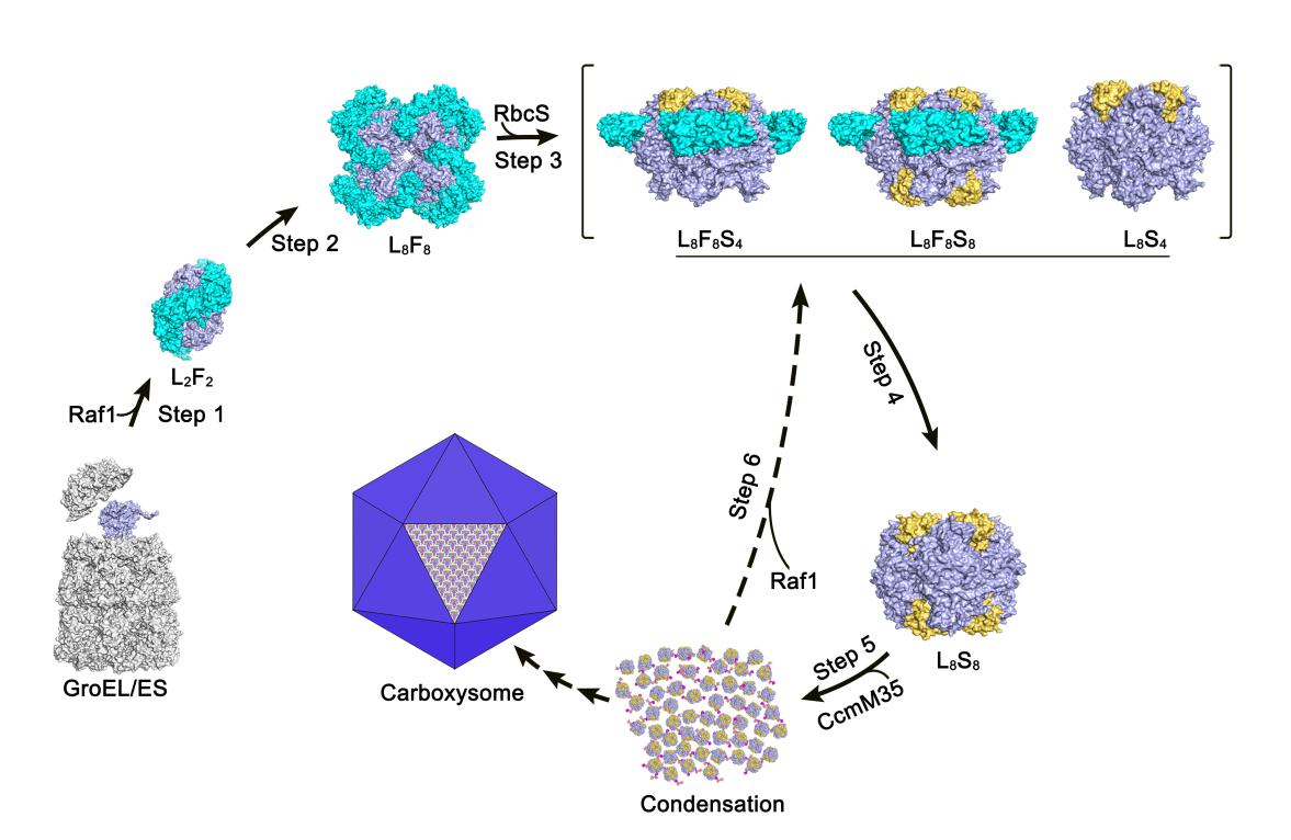 RuBisCO是地球上丰度最高的酶,总质量约为7亿吨,催化光合作用暗反应的碳同化过程,每年将地球上超过1000亿吨CO2固定为有机物。然而RuBisCO的催化效率极低,每个RuBisCO全酶每秒钟只能催化3~10个CO2分子的转化。为了应对环境中CO2浓度的不断降低,蓝藻进化出CO2浓缩机制(CCM),通过羧酶体包裹RuBisCO并高度富集CO2,从而提高催化效率。蓝藻和植物中的I型RuBisCO全酶由8个大亚基RbcL和8个小亚基RbcS组成,其组装和成熟过程需要多个分子伴侣的帮助,包括GroEL/ES、RbcX和Raf1等。将蓝藻的CCM系统引入植物被认为是一种潜在的提高植物光合效率的方法,然而迄今为止对于RuBisCO组装和成熟的精细过程仍然不清楚,极大限制了RuBisCO的工程改造和活性优化。