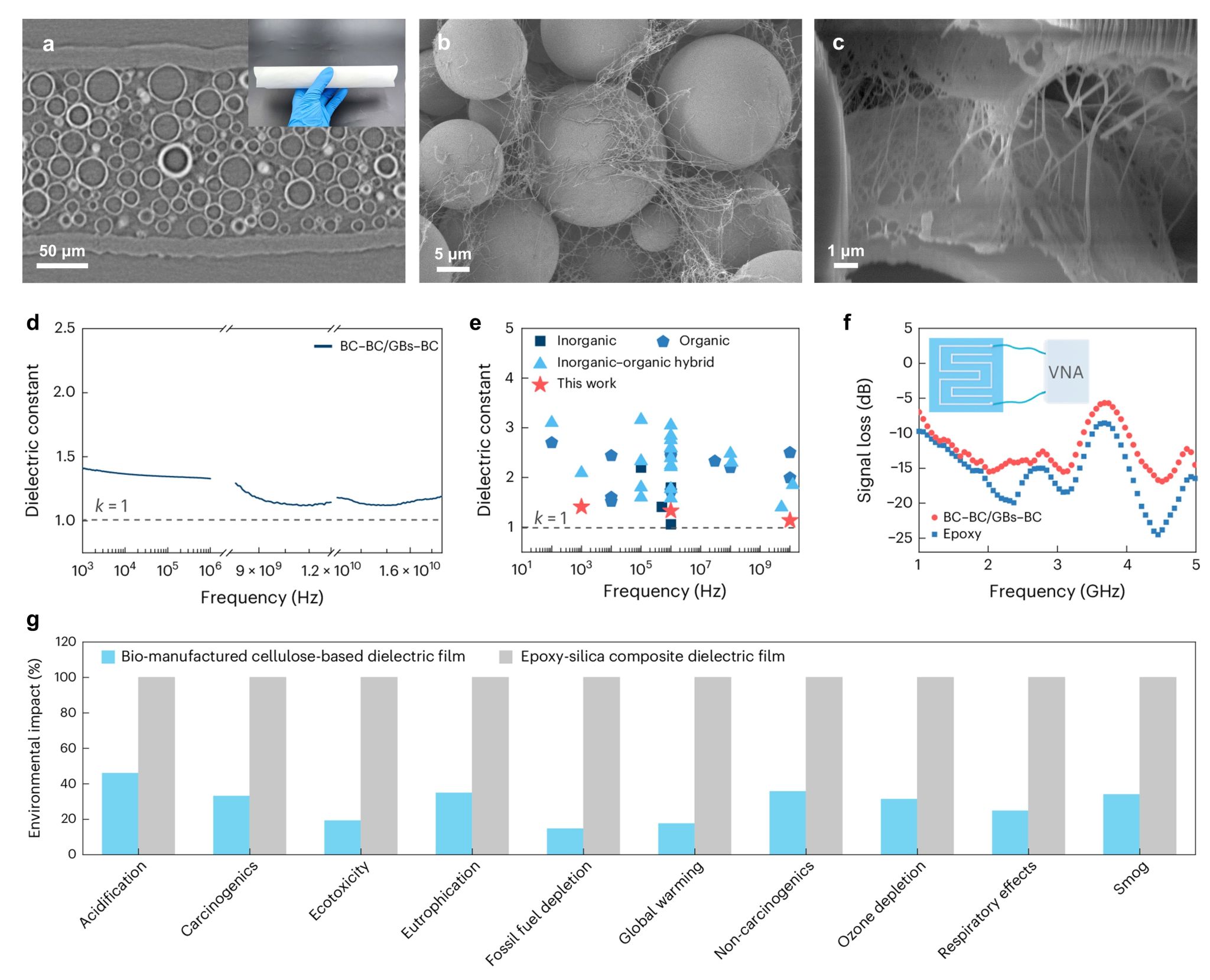 得益于气溶胶辅助生物合成法及基于此的三明治结构设计(图2a-c),所获得的细菌纤维素/玻璃微珠复合介电薄膜展现出高拉伸强度和杨氏模量、低介电常数、低热膨胀系数、良好柔韧性以及表面光滑等特性。该纤维素基介电薄膜的介电常数低于目前已报道的各种有机-无机复合介电材料(图2d,e)。人工干预下的细菌自发生命活动实现了独特的高孔隙率结构的制备,密堆积的玻璃微珠内部以及之间的空气对复合材料的性能提升起到重要的作用。因具有优异的综合性能结合闭环生物可回收性,这种纤维素基介电薄膜在可持续电子器件领域具有巨大应用潜力,如基于纤维素基介电薄膜加工的电子器件的信号传输损耗显著低于商用的环氧树脂基底(图2f)。有关成本和生命周期评估分析表明,与商用介电薄膜相比,这种生物制造的纤维素介电薄膜成本与其相当,但在人类健康和自然资源方面显著降低了对环境的影响(图2g)。这种结合气溶胶辅助生物合成和酶降解的闭环生物回收策略,对开发下一代可持续电子材料和电子器件具有重要的指导意义。