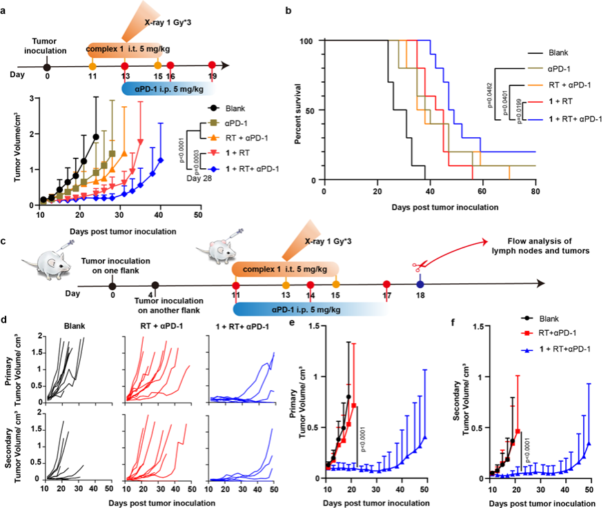 图2. Complex1增敏放疗改善αPD-1治疗与远隔效应