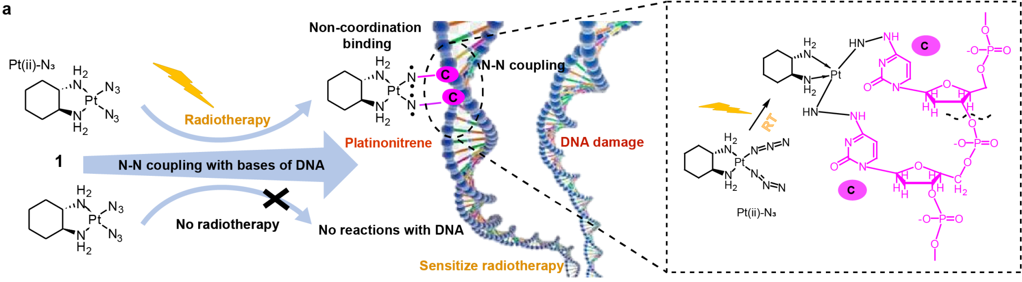 针对上述难题,中国科大闵元增教授团队设计合成了一种新型铂系叠氮基配合物,创新性地利用放射线诱导其在肿瘤原位生成高活性铂氮宾中间体(图1),实现了肿瘤部位的精准、可控增敏。该复合物本身无明显毒性,仅在放疗的作用下才会生成铂氮宾并与DNA碱基发生N-N偶联,形成稳定的Pt-N-N-DNA结构,显著增强放射线对肿瘤细胞DNA的损伤效应,且其增敏机制不依赖活性氧。