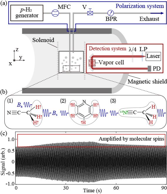 图1.基于超极化分子核自旋的磁场放大