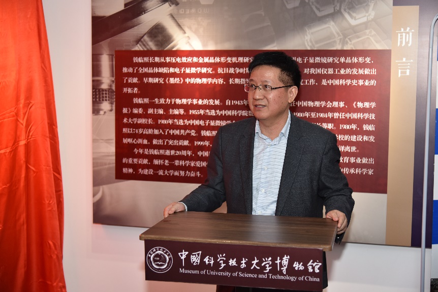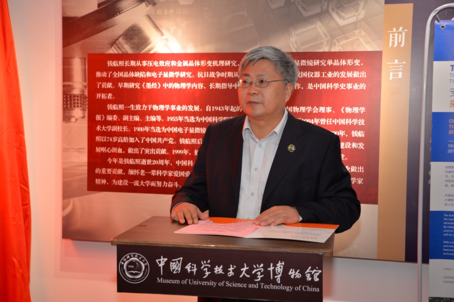 舒歌群书记在致辞中指出,钱临照先生是我国著名的物理学家、教育家。他长期从事压电效应和金属晶体形变机理研究,在国内首先用电子显微镜研究单晶体形变,推动了全国晶体缺陷、电子显微学研究和科学技术史等领域的研究,对我国科技和教育事业做出了重要贡献。1958年在我校创办之初,钱先生就来学校工作,他亲自登台授课,培养了大批科技英才。1970年,钱临照先生随科大南迁合肥,是当时随学校南迁的仅有的两名院士之一。在学校第二次创业中,钱先生发挥了重要作用。钱先生的后半生与学校同呼吸共命运,直到1999年在他深爱着校园中离世。钱临照先生是新中国第一代归国科学家的杰出代表,科教报国、潜心执教的楷模。在钱先生逝世20周年之际,校博物馆举办这个展览,深切缅怀老一辈科学家爱国情怀和奉献精神,激励我校广大师生不忘初心、牢记使命,潜心立德树人、执着攻关创新,树立科学报国之志,以真才实学服务人民,以创新创造贡献国家。接着,舒歌群书记指出,从科技发展历史看,近代科学的源头在古希腊。安提凯希拉机械正是公元前二世纪古希腊的天文学理论水平和仪器制作工艺的集中体现。希望广大师生,通过近距离观看本次展览,领略古代西方科学技术发展的文明成果,提升科技人文素养,丰富校园文化氛围。