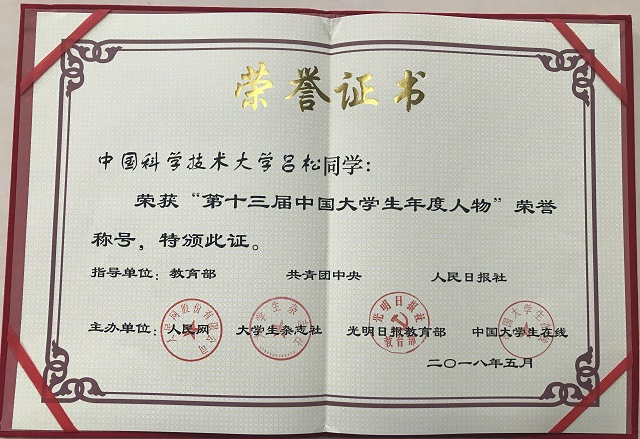 由教育部、共青团中央、人民日报社共同指导,人民网、大学生杂志社、光明日报教育部和中国大学生在线联合主办的“第十三届中国大学生年度人物评选”活动圆满落幕,我校共有三名学生入围,分别是热科学和能源工程系2017级博士研究生吕松、合肥微尺度物质科学国家研究中心2016级硕士研究生冯超和物理学院2015级本科生徐高阳。其中吕松同学在200名入围学生中脱颖而出,最终获得“第十三届中国大学生年度人物”称号。
