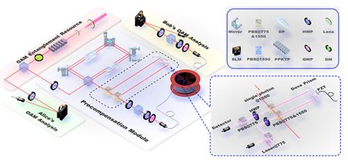 量子纠缠作为量子通讯、量子精密测量和量子计算等量子信息过程的重要资源,其长距离分发对于量子技术的实用化及量子物理基本问题的检验至关重要。高维系统拥有更高的信道容量,更强的抗窃听能力以及更有效的量子计算能力。光子的轨道角动量是近年来被广泛关注的高维系统,在维度扩展性方面极具优势。然而轨道角动量纠缠易受大气湍流或光纤中模式串扰及模式色散的影响,在此之前仅能传输几米的距离,并且局限于二维纠缠的分发。