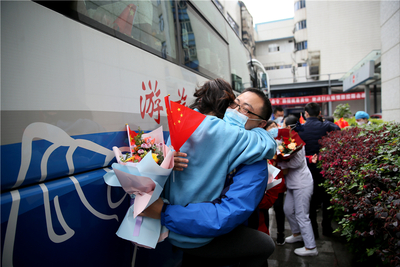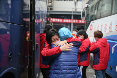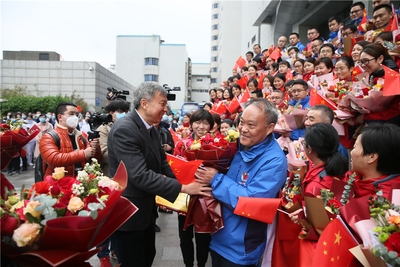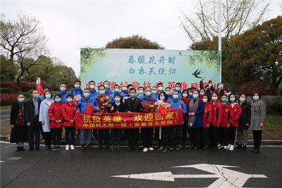 欢迎仪式上,舒歌群、包信和、刘连新向队员们献上鲜花并合影留念。很多队员的家人、同事也来到现场,接队员们回家。医院将继续给队员们为期一周的假期休息,让逆行的英雄们享受与家人团聚的时光。