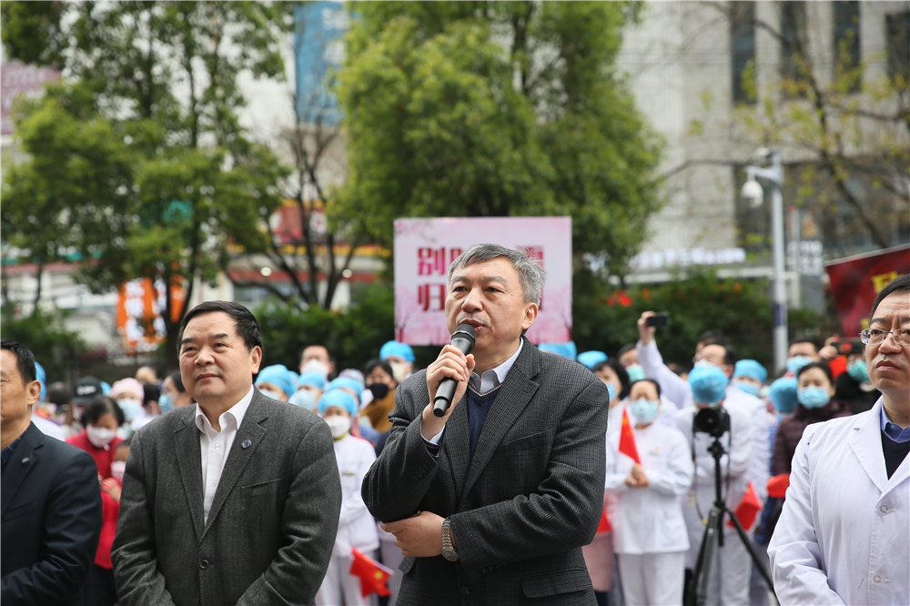 舒歌群书记在致辞中指出,在新冠肺炎疫情形势最严峻的时候,附一院援鄂医疗队162位医务人员,响应习近平总书记和党中央的号召,白衣执甲、逆行出征,投身湖北保卫战、武汉保卫战,为武汉和湖北的疫情防控工作作出了重要贡献,不仅圆满完成各项任务,还确保所有队员“零感染”,得到受援医院和同行的高度评价;魏海明教授和徐晓玲副院长团队开展的免疫治疗方案被列入第七版《新型冠状病毒肺炎诊疗方案》向全国、全世界推广,为打赢新冠肺炎疫情贡献了科大力量和科大方案。舒歌群指出,附一院是中国科大抗击疫情的重要力量和阵地,以实际行动为中国科大“科教报国、追求卓越”的初心使命赋予了新的内涵,是新科大人的生动代言,中国科大以大家为傲!