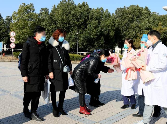 从救治病区的医护人员手中接过鲜花,4位患者第一次见到与他们朝夕相处、脱掉隔离服和面罩的医护人员,一再表示感谢。