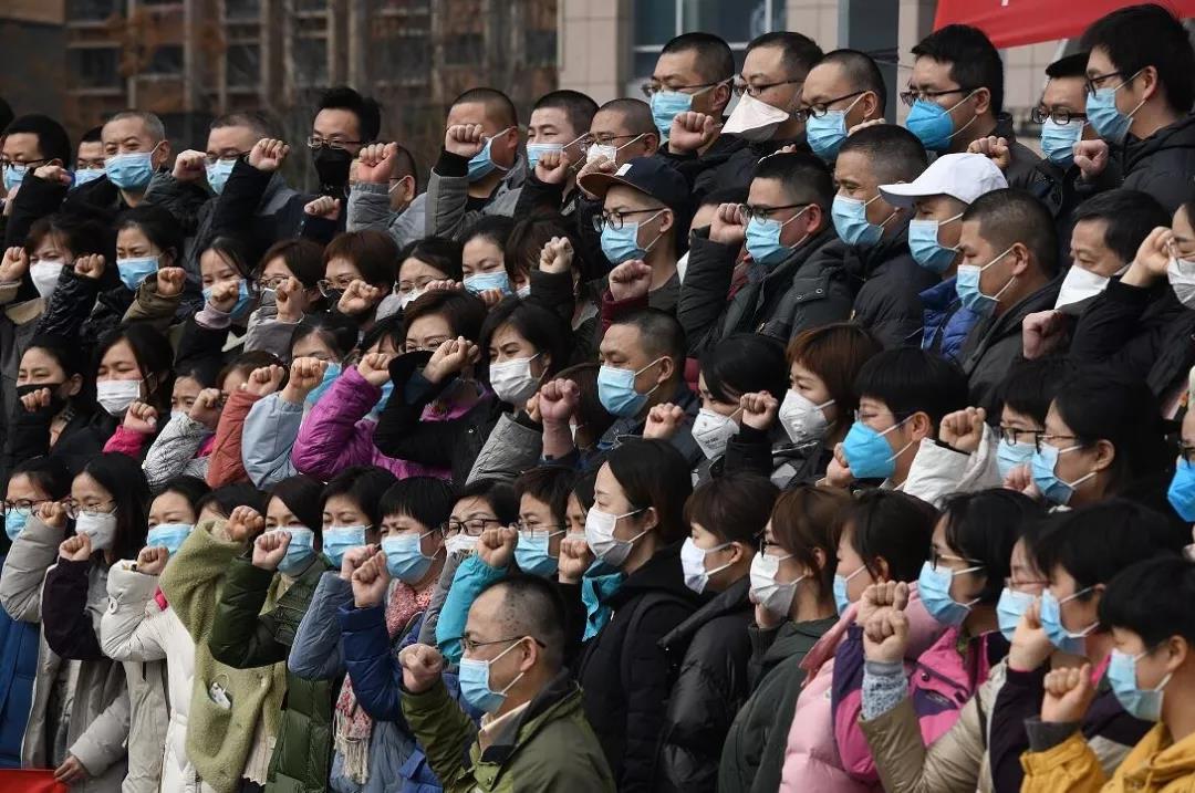 医疗队队长兼支部书记鲁朝晖带领队员们宣誓:“我将听从指挥,勇于担当,不辱使命,团结一心,科学防控,消除病魔,众志成城,坚决完成任务!”