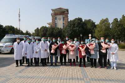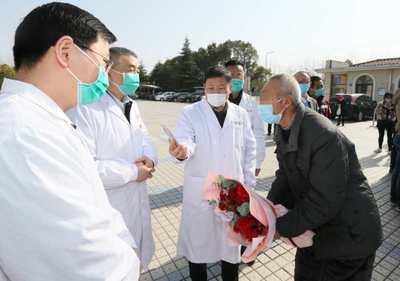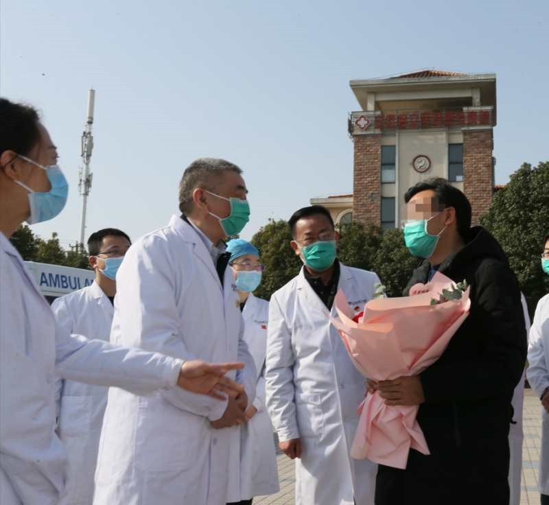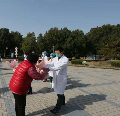 出院患者接过医务人员送上的鲜花,向多日来精心救治护理他们的医务人员表达谢意。中国科大附一院(安徽省立医院)党委书记刘同柱向出院患者表示祝贺,叮嘱大家回家好好休息,做好居家隔离。