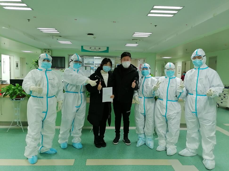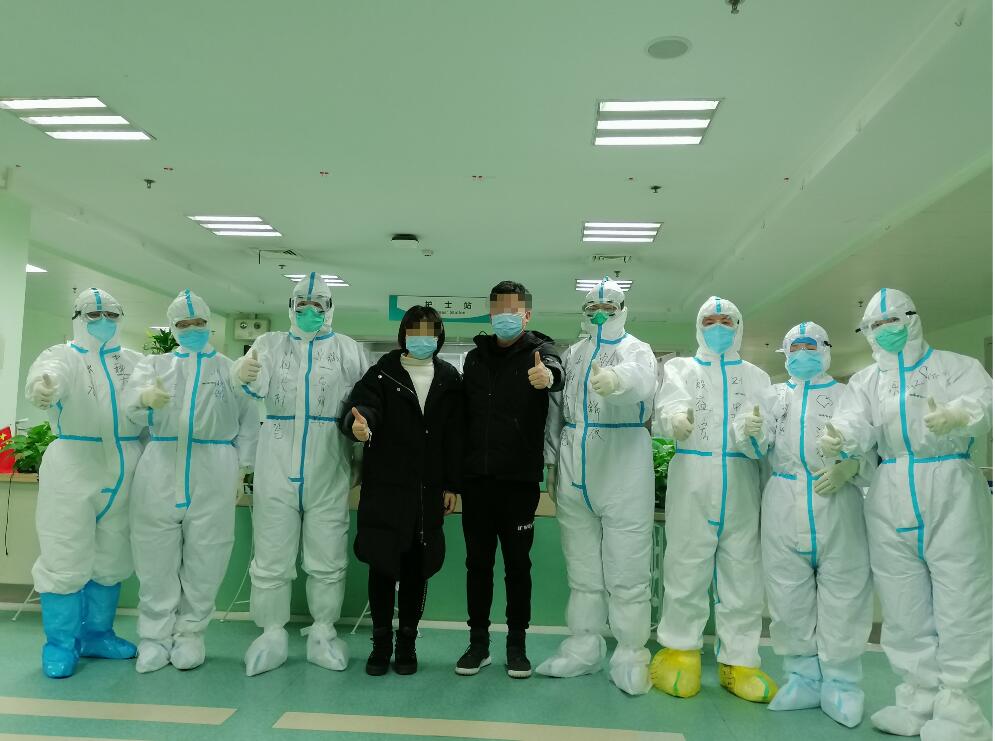 病区医护团队在给予抗病毒等对症支持治疗的同时,经常对他们说:“莫慌,你们蛮杠,蛮快就要出克了,葛自噶加油(不要慌张,你们非常棒,很快就要出去了,给自己加油!)”,增强他们的战“疫”信心。在病情出现反复的时候,领队鲁朝晖带领大家进行病例讨论,及时调整治疗方案;夫妻俩也相互鼓励,增强信心。经过科学诊疗和精心救护,经专家组讨论认为,李先生和蒋女士诊断明确,治疗确切有效,体温正常已超过3天,无明显呼吸道症状,连续两次呼吸道病原核酸检测均为阴性。按照国家卫生健康委《新型冠状病毒肺炎诊疗方案(试行第六版)》,两人均达到解除隔离及出院标准,建议解除隔离出院,居家医学观察14天并做好密切随访。当得知病已治愈,可以出院了,夫妻俩终于舒展眉头,露出了久违的笑容。
