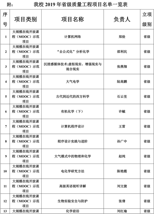 2019年省级质量工程项目申报工作于2019年10月份启动,教务处根据有关通知精神以及省教育厅对我校“双一流”学科建设的支持政策,动员各单位积极组织申报,经过院校两级的评审遴选,我校于2019年11月下旬完成了向省教育厅的推荐申报工作。我校申报的项目包括:一流本科人才基地、一流课程、高水平教师队伍建设、高等教育教学改革研究、协同育人项目、创新创业教育和实践教学项目以及教学成果奖等七大类16个项目类别。
