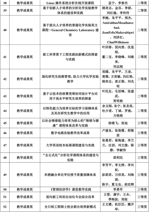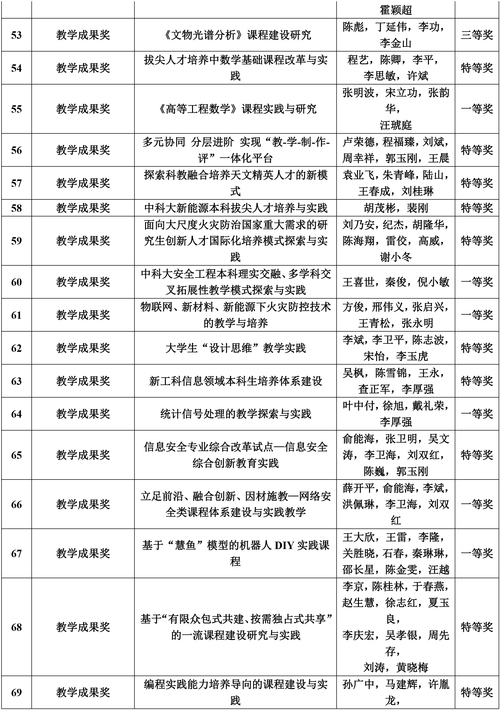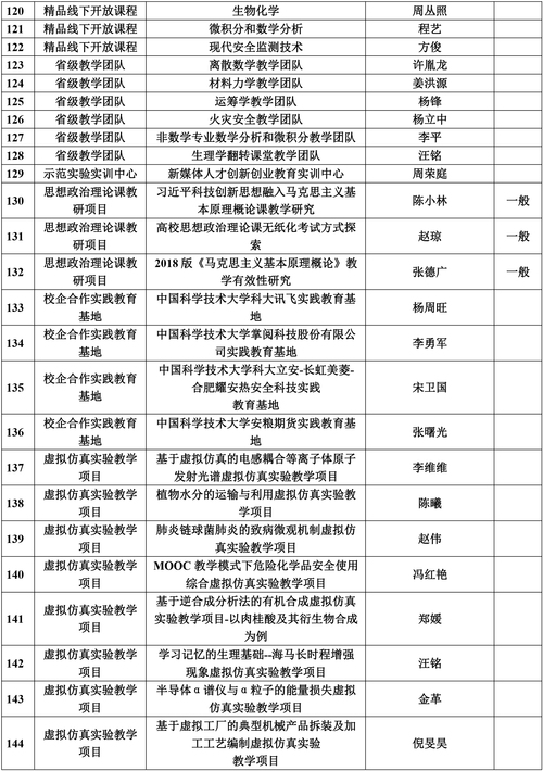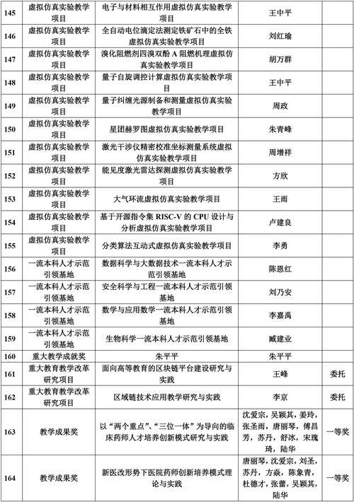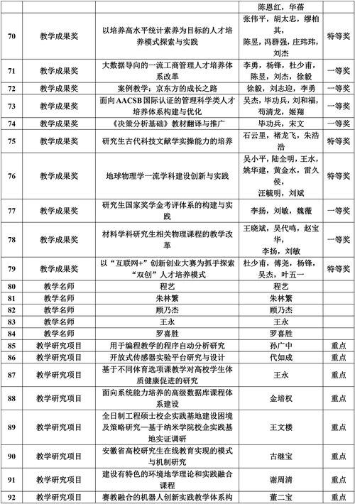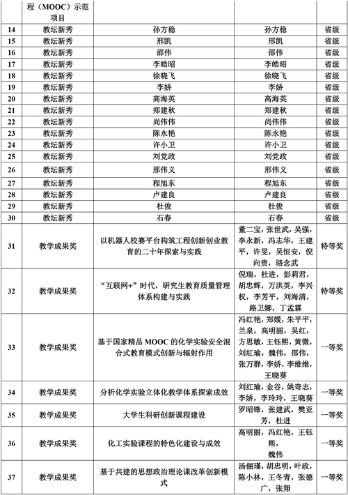 经过省教育厅组织的专家评审并公示,我校“以机器人校赛平台构筑工程创新创业教育的二十年探索与实践”等49项成果分别获省级教学成果特等奖至三等奖、朱平平老师获重大教学成就奖、程艺等5位老师被评为安徽省教学名师、孙方稳等17位老师被评为安徽省教坛新秀,“用于编程教学的程序自动分析研究”等40个教学研究项目、“计算机网络”等13项大规模在线开放课程(MOOC)示范项目、“生物化学”等3门精品线下开放课程、“基于虚拟仿真的电感耦合等离子体原子发射光谱虚拟仿真实验教学项目”等19个虚拟仿真实验教学项目均获省级立项。我校还入选一流本科人才示范引领基地4项、校企合作实践教育基地4项、示范实验实训中心1项、省级教学团队6项。另外,中国科学技术大学附属第一医院(原省立医院)作为我校的附属单位参加省级质量工程项目申报,获教学成果一等奖2项、省级教研项目和精品线下开放课程共计31项。我校在2019年省级质量工程项目申报工作中取得了丰硕的成果(见附件)。