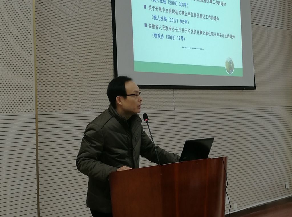 李方元向大家汇报了学校养老保险制度改革的相关情况,他从改革背景、改革内容和退休待遇发放方式变化三个方面做了详细的介绍,并发放了相关宣传手册,进行了现场答疑。