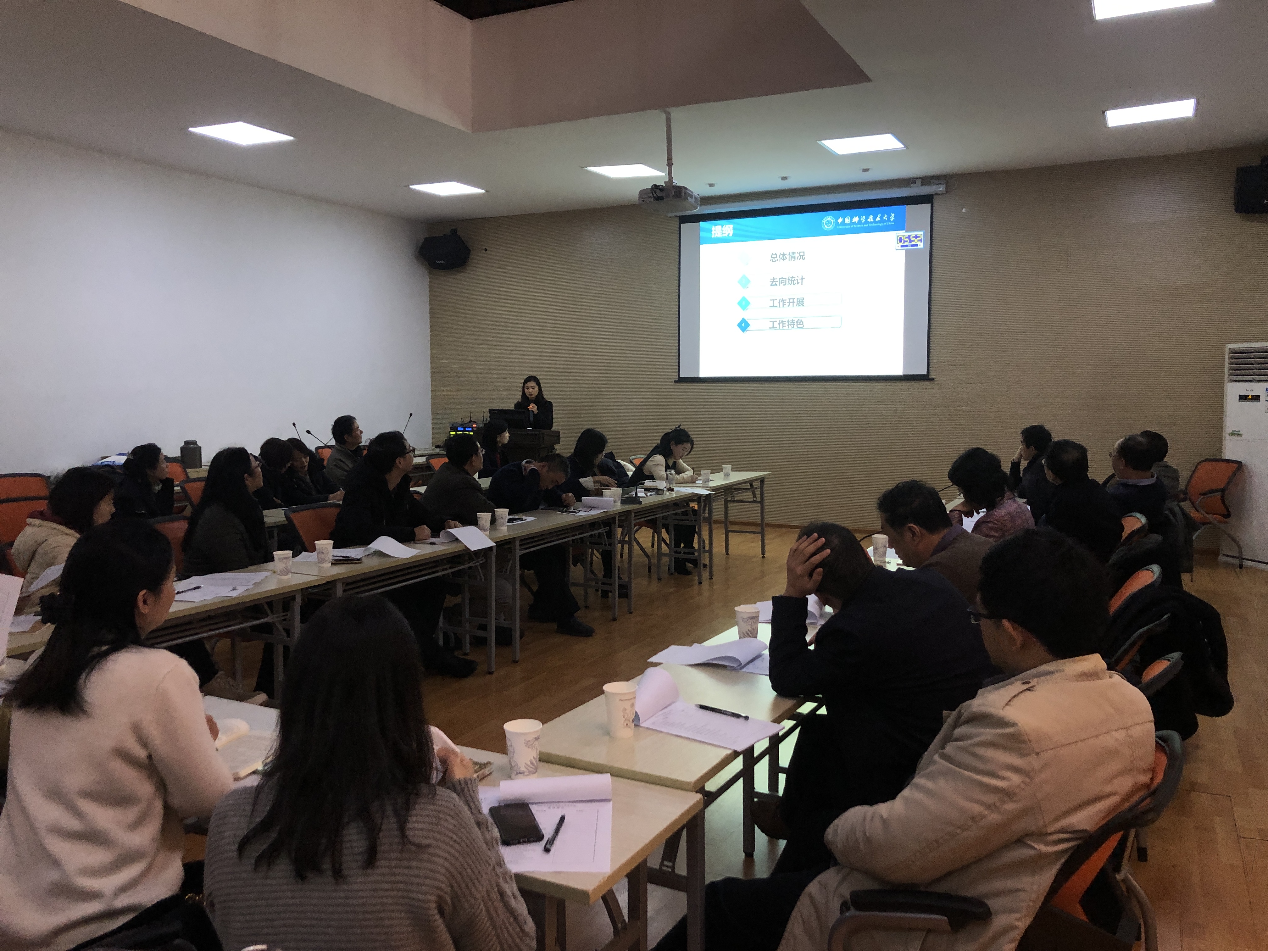 招生就业处副处长魏英向大家介绍了评审规则、流程及2019年学校就业工作先进集体及先进个人申报情况,对各学院(单位)近三届毕业生年终就业率进行了通报和分析。