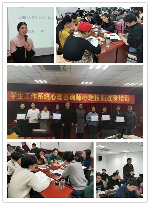 安徽省教育厅高等学校心理健康教育专家指导委员会委员、中国注册督导师、安徽师范大学陶金花博士应邀做了《认知行为疗法(CBT)理论与技术》的专题培训。在为期两天的培训中,陶金花博士以理论讲授、案例解析和实操训练相结合的方式教学,为大家系统解读了CBT理论和技术。通过学习,大家初步了解了CBT的工作原理和原则,借助认知三角模型小组练习,理解并感受到每一个事件情绪背后的认知和信念元素;通过案例解析进一步引导大家识别个体的自动思维和核心信念对行为的影响,以情境三栏表、思维记录五栏表等方式去探索和练习,达到个体缓解情绪、调整观念、矫正行为的目的。在两天的培训中,陶金花博士特别强调心理咨询师工作的“知行合一”,关注学生的内心,以合理的观念引导出适当的行为,更要以专业和坦诚的态度呈现了一个心理助人者的人格力量,由内而外,润物无声,引导学生形成良好的认知和健康的心理。