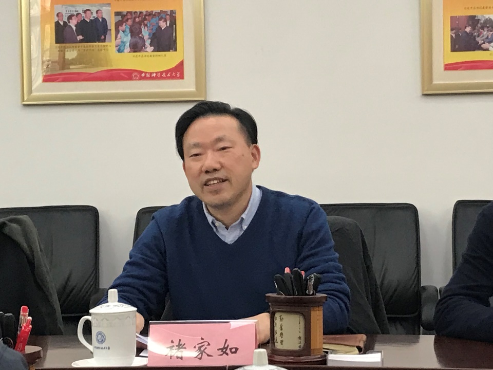 褚家如代表学校热烈欢迎李金生一行到访,他感谢人力资源和社会保障部和安徽省人力资源和社会保障厅对我校博士后流动站和博士后工作建设长期以来的大力支持。褚家如详细介绍了我校聘期制科研人员管理制度的改革和发展历程、优秀青年人才培养成果、以及中国科学院特别研究助理制度实施办法等。