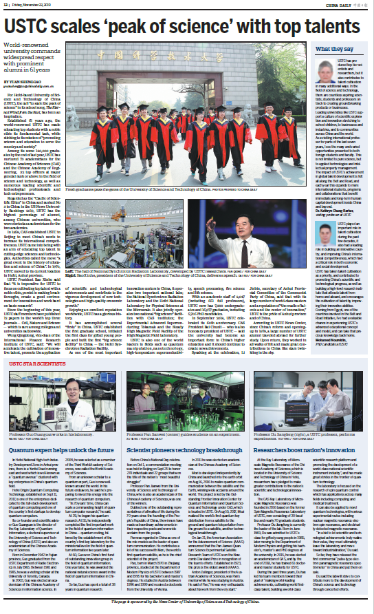 专题文章“USTC scales‘peak of science' with top talents”(中国科大:顶尖人才勇攀科学高峰)以中国科大的校歌作为开篇,介绍了这所年轻的大学,从创建伊始就以“科教报国”为己任,在短短61年历史上,已经在多个国际著名排行榜取得前三的好成绩,截至去年,培养了73名两院院士、32位科技将军,并在量子调控、纳米材料、高温超导、语音处理、火灾科学和生命科学等领域处于国际领先地位。