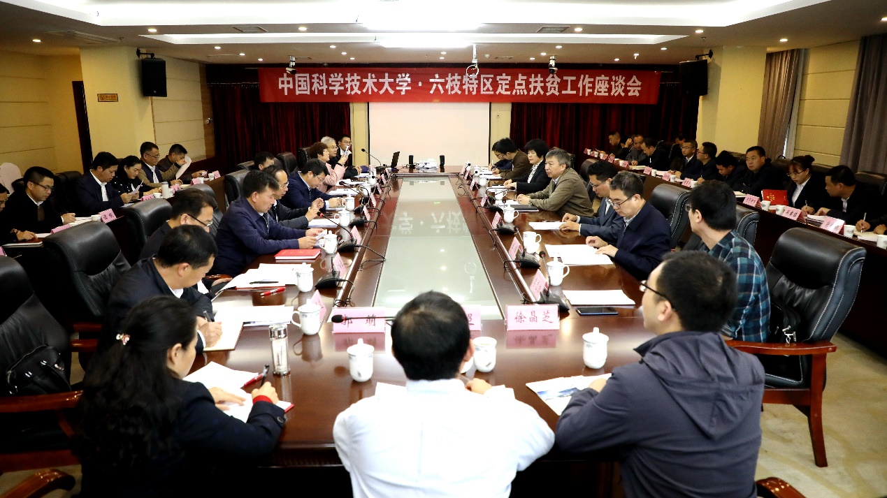 10月23日上午,舒歌群一行在六枝特区召开定点扶贫工作座谈会。贵州省扶贫办副巡视员潘元星,一级调研员鲜迎筑,六盘水市委副书记、市长李刚,市委常委、副市长孙文田,市政府秘书长罗资湘,市委副秘书长、市扶贫办主任蒋泽选,六枝特区党委副书记、区长方裕谦等参加会议,会议由六盘水市人大常委会党组成员、六枝特区党委书记杨昌显主持。方裕谦、陈超分别汇报了六枝特区脱贫攻坚工作开展情况和学校定点帮扶工作进展。李刚代表六盘水市委、市政府对中国科大倾注感情、倾尽全力的帮扶表示感谢,希望学校一如既往地关心、支持六盘水经济社会发展,进一步加强定点扶贫工作。
