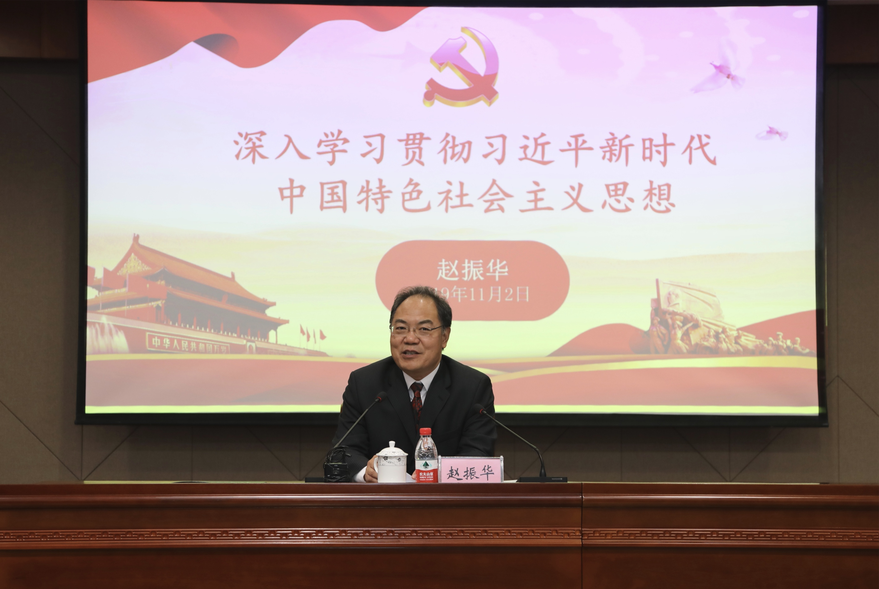 赵振华教授从学习贯彻习近平新时代中国特色社会主义思想的原因入手,用生动鲜活的案例,系统阐述了坚持正确指导思想的必要性。他深入讲解了习近平新时代中国特色社会主义思想的产生背景、丰富内涵,全面分析了学习贯彻习近平新时代中国特色社会主义思想的方法路径。辅导报告对帮助深入领会习近平新时代中国特色社会主义思想,提高政治站位,扎实推进“不忘初心、牢记使命”主题教育具有重要指导意义。