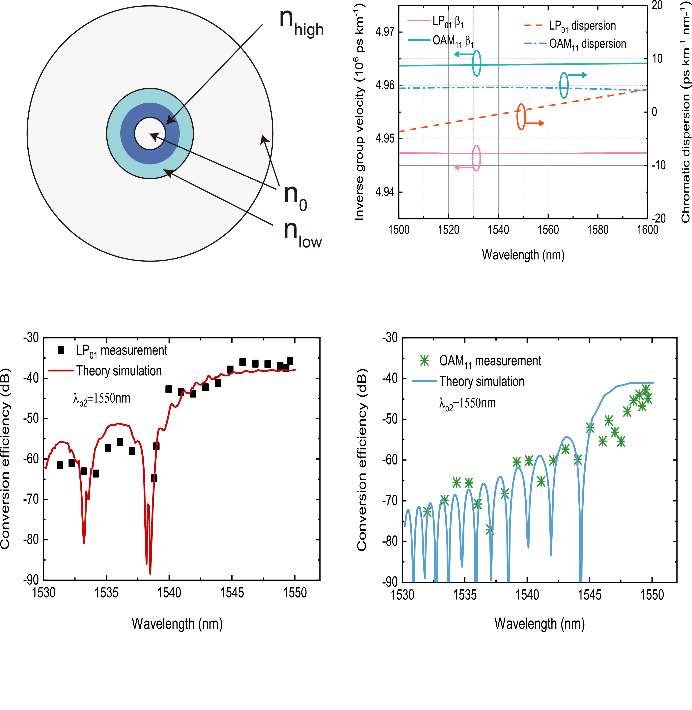该工作通过对涡旋光纤空间维度的群速度色散特性操控,不仅实现了稳定的轨道角动量模式传输,而且同时实现了多个模式相位匹配,在实验上首次验证了一种低串扰、多模式的轨道角动量光的模内四波混频现象,实验结果与设计理论相符。同时,这种新型的涡旋光纤具有相当平坦的非线性增益带宽,可同时对多个轨道角动量模式提供放大,为高维复用光通信光放大提供一种技术途径。
