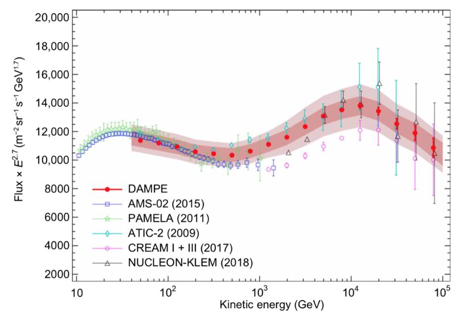 图1. “悟空”号探测的40 GeV-100 TeV能段宇宙线质子能谱(红点)。图取自DAMPE collaboration (2019 Sci. Adv.)。