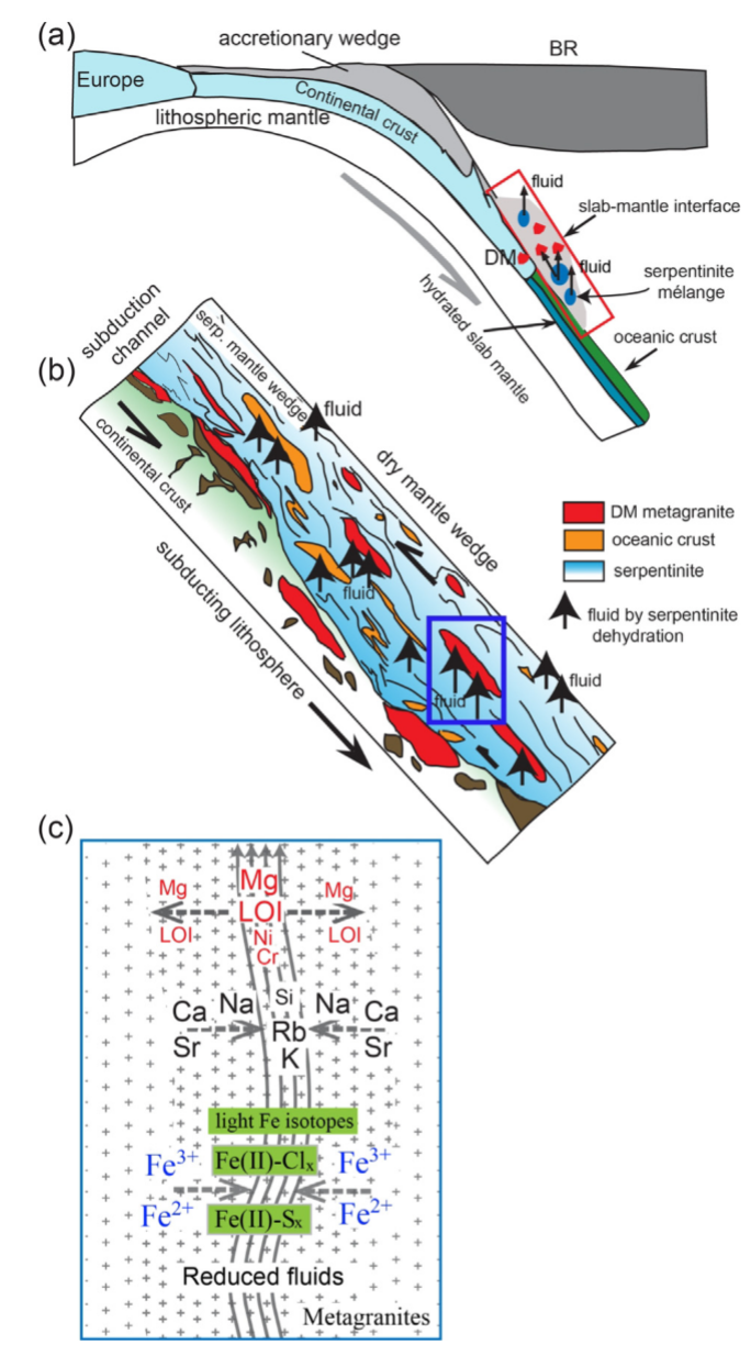 Fe同位素结果指示在流体交代过程中Fe的活动以Fe2+为主,同位素分馏模拟揭示其种型主要为Fe(II)-Cl和Fe(II)-(HS)络合物。这些结果表明俯冲带深部流体局部应为高盐度、HS-存在的还原性流体,与前人的岩石学观察一致。这与前人普遍认为的俯冲带深部流体具有高氧化性特征显著不同。该团队根据西阿尔卑斯造山带的构造演化特征,进一步提出了大陆俯冲隧道中俯冲板片-地幔楔界面流体交代过程中Fe迁移的构造模型(图2)。总之,这项成果提供了利用Fe同位素示踪俯冲带深部流体性质的新思路和典型案例,揭示了俯冲带深部局部相对还原性流体的存在,对理解弧岩浆和地幔楔的氧化还原状态和Fe同位素体系都具有重要意义。