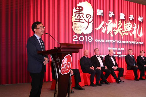 9月18日下午,首届“墨子量子奖”颁奖典礼在合肥隆重举行。安徽省委常委、常务副省长邓向阳出席颁奖典礼并致辞,中国科大党委书记舒歌群、校长包信和为获奖者颁奖。安徽省有关部门领导,墨子量子科技基金会捐赠企业代表,以及参加2019年度新兴量子技术国际会议的500余位量子信息技术研究领域知名专家学者出席颁奖典礼共同见证。诺贝尔物理学奖获得者杨振宁,“墨子量子奖”国际专家评选委员会主席、中国科学院院长白春礼专门为颁奖典礼录制了视频,对获奖者致以热烈的祝贺。颁奖典礼由墨子量子科技基金会理事长罗毅教授主持。