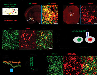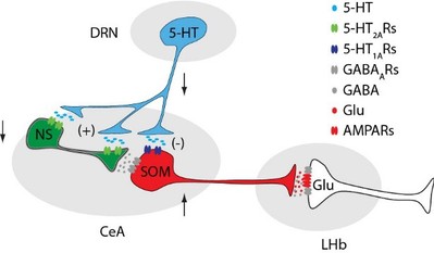 5-HT系统失调是抑郁症发病的经典理论之一,目前临床上一线抗抑郁药物5-HT选择性重摄取抑制剂便是通过提高脑内5-HT含量发挥抗抑郁效果。DRN是脑内合成5-HT的主要核团,参与调节疼痛以及情感障碍等行为。进一步研究发现,在持续疼痛伴抑郁样行为小鼠中,DRN投射到CeA的5-HT能神经元活性降低,使得CeA中5-HT的含量降低,这种降低最终导致了SOMCeA神经元脱抑制而兴奋。光遗传或化学遗传调控5-HTDRN→SOMCeA神经环路活性,可显著改善疼痛及抑郁样行为。