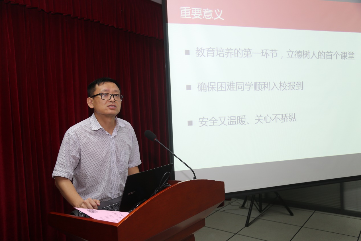 学生工作部处部处长李峰强调指出,迎新工作是教育培养的第一环节,是立德树人的首个课堂,要按照“安全又温暖、关心不骄纵”的原则,能力做好各项工作,确保本科新生顺利入校报到。随后,他详细介绍了迎新工作总体安排、新生入学教育和“绿色通道”工作。
