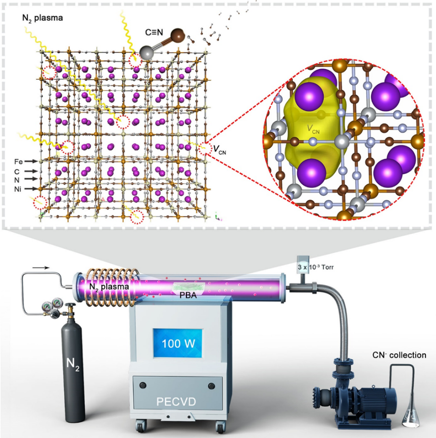 研究人员以钼酸镍纳米棒为模板,首先制备出多孔的镍铁基PBA材料,随后对其进行氮气等离子体轰击,即可得到富含有氰基空位的PBA催化剂。通过多种表征手段,例如高分辨透射电镜、正电子湮灭技术、元素含量分析、以及尾气吸收检测等,确认这种新型氰基空位的形成(图1)。