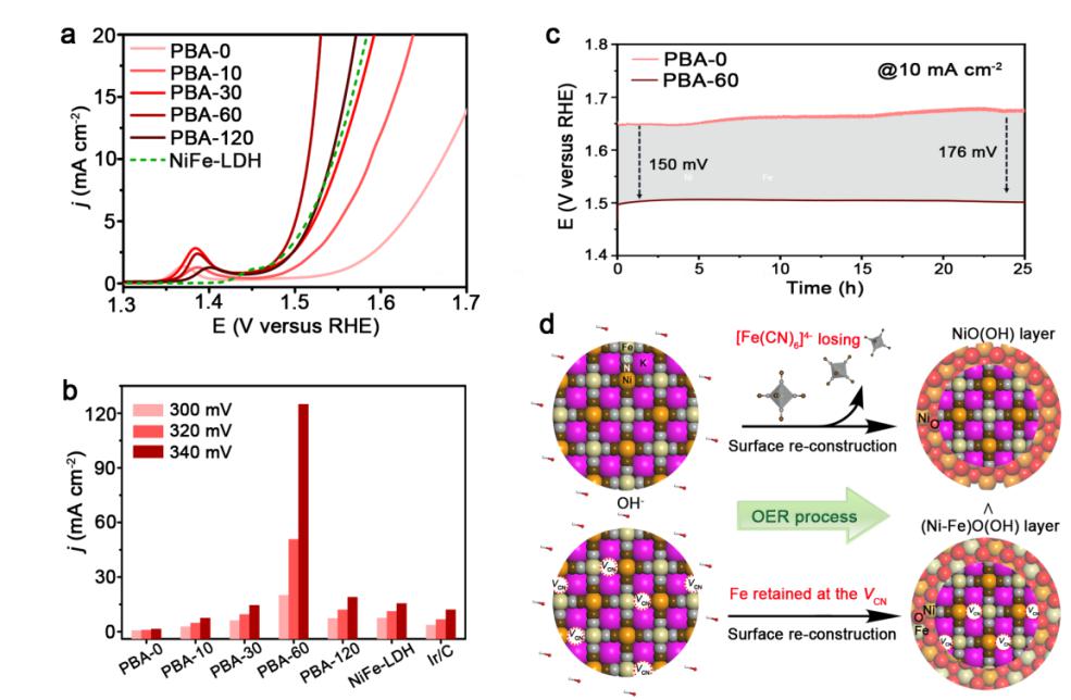 图2.(a)不同催化剂的OER极化曲线;(b)不同催化剂的电流密度对照;(c)PBA-0和PBA-60催化剂的OER稳定性测试;(d)PBA-0和PBA-60催化剂的OER表面重构示意图。