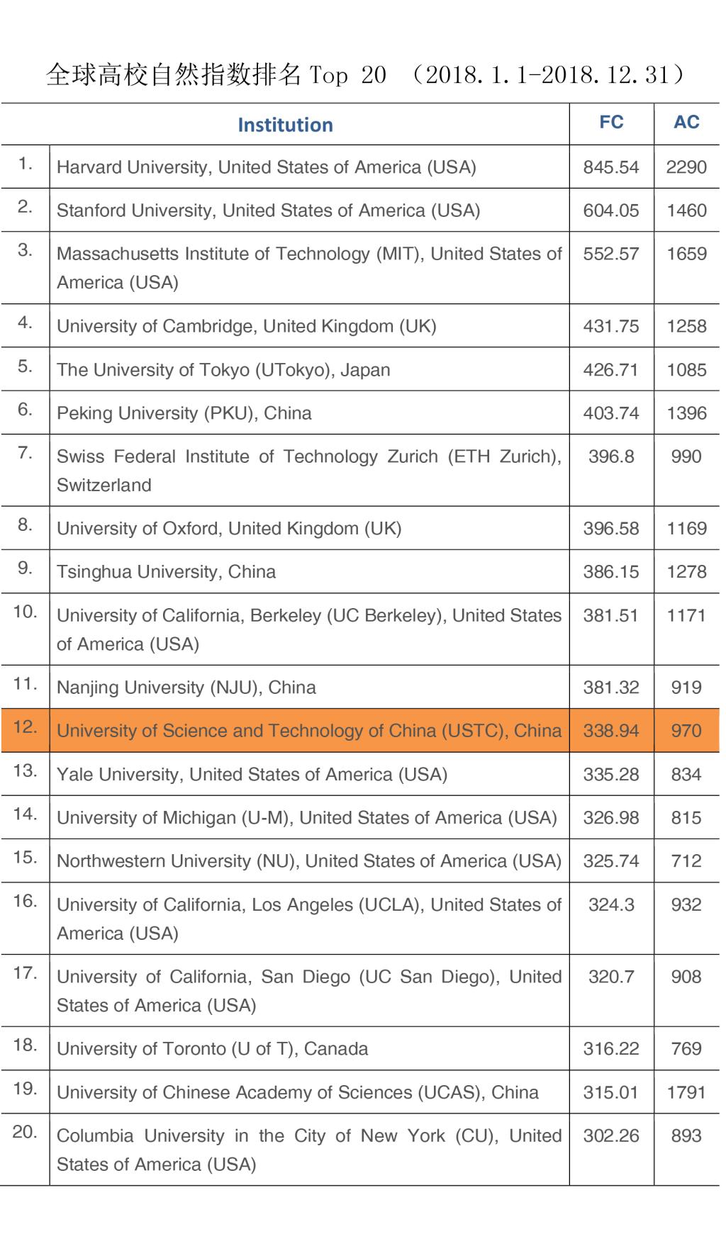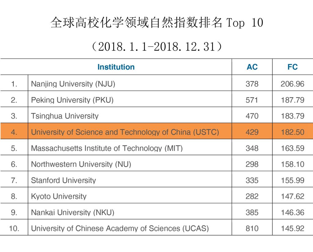 6月20日,自然指数网站更新了2019年自然指数排名。此次自然指数更新统计时间段为2018年1月1日至2018年12月31日。中国科大在82种自然科学期刊上共发表970篇论文,FC指数338.94,在全球高校中位居第12位,较2018年上升6位,在中国大陆高校位居第4位。