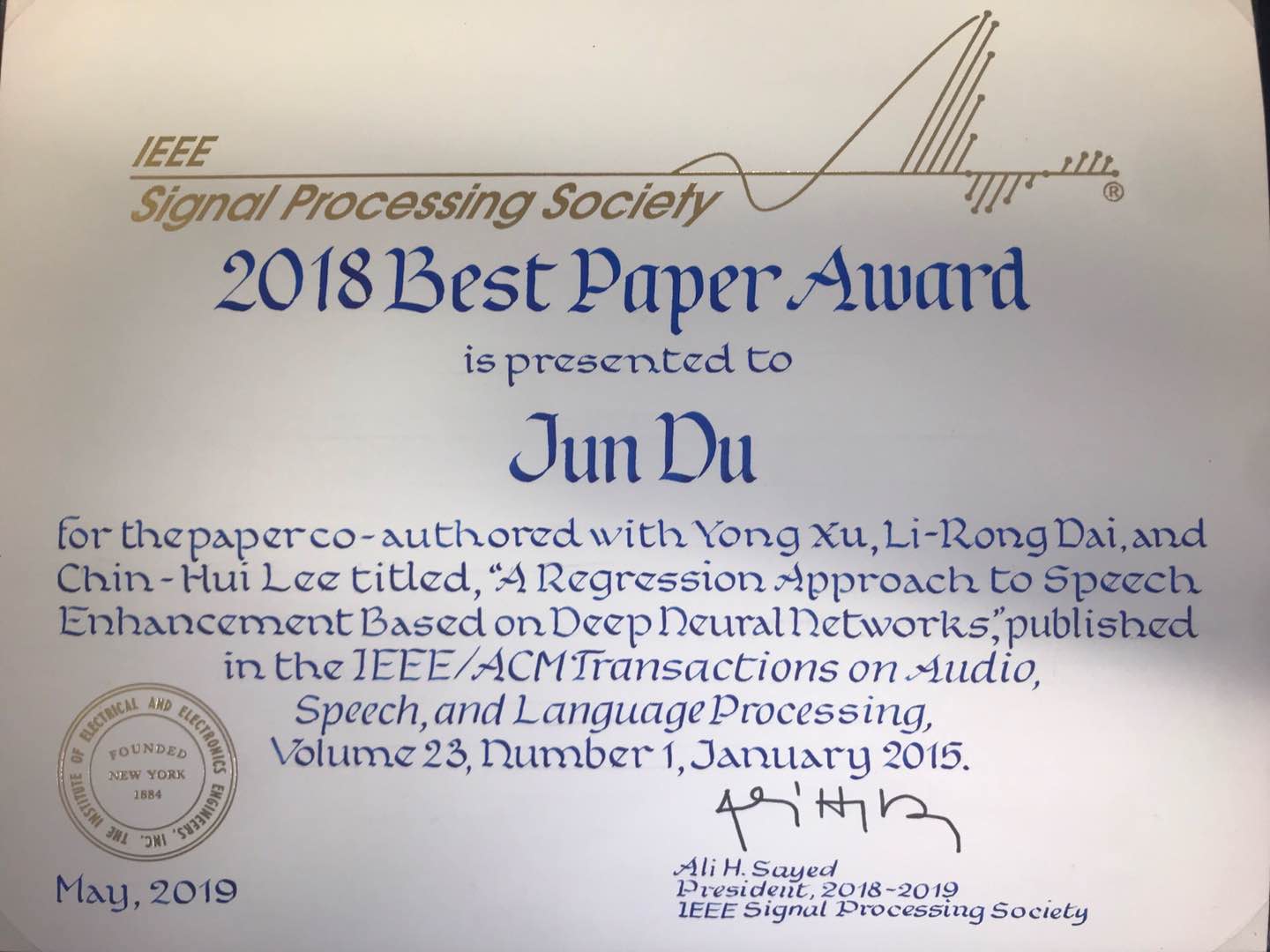IEEE信号处理学会是IEEE下属主要学会之一,其颁发的最佳论文奖是信号处理领域最有影响力的国际学术奖项之一。该奖项是由IEEE信号处理学会下12个领域的技术委员会自过去五年内IEEE信号处理学会的优秀论文中依论文品质及原创性中提名,经IEEE信号处理学会奖励委员会经过激烈评选后,最多提名6篇论文获得该奖项。在语音领域,这是首次以国内为第一单位发表的最佳论文奖,能获此荣誉,体现了这一工作的开创性和新颖性。依据谷歌学术,该论文目前引用数目达400余次,也是ESI高被引论文(ESI Highly Cited Papers)。