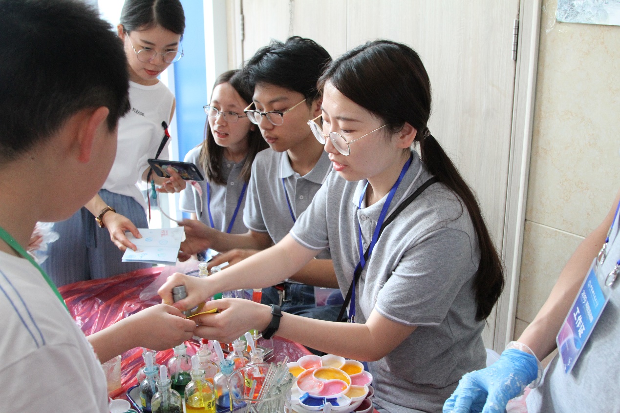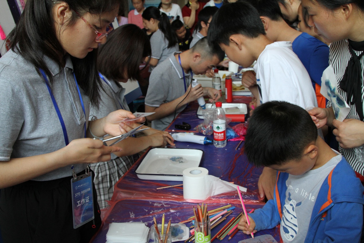 2019年是元素周期表诞生150周年,被联合国大会宣布为“国际化学元素周期表年”。环资楼门前设立的元素周期表巨幅展板引起了参观者的广泛关注。环资楼一楼大厅开设了二十多个趣味化学实验:热缩片、动力液滴、分子模型搭建、海藻酸钙微胶囊制备、牛奶豆浆、琼脂果冻、水果电池、叶脉书签制作等活动,深受广大群众与小朋友们的欢迎。早上不到开放时间,大厅里就涌入大量热情期待的参观者。在志愿者的讲解和指导下,前来参观的小朋友们纷纷动手体验,不仅感受了化学实验的乐趣,还凭借参与活动积攒的印章兑换到精美的学校纪念品。