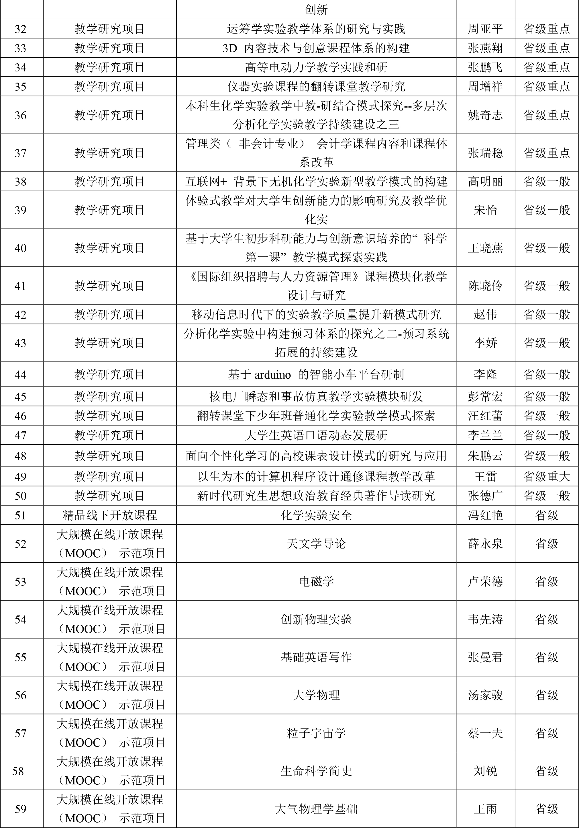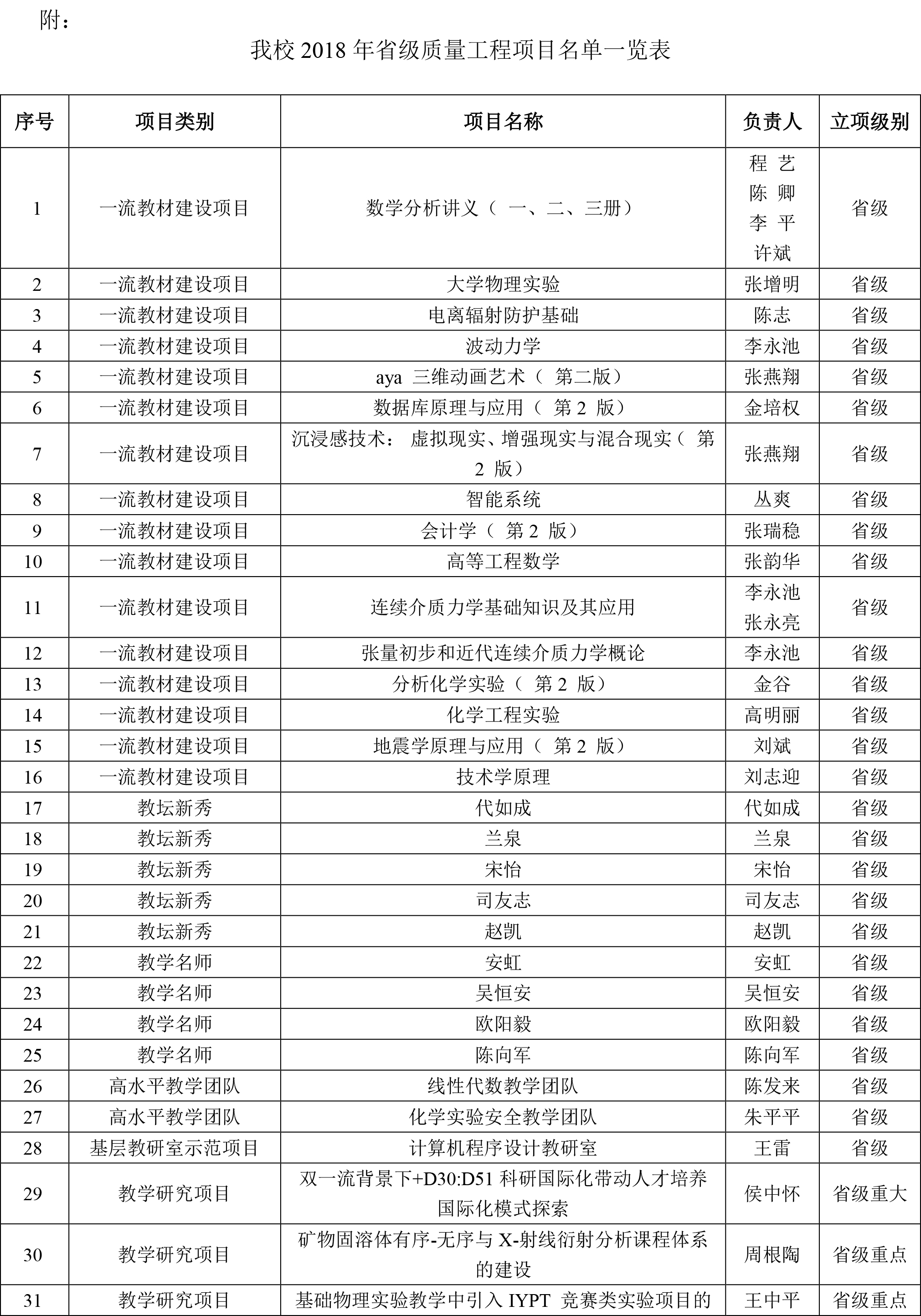 经过省教育厅组织的专家评审,我校安虹等4位老师被评为安徽省教学名师、代如成等5位老师被评为安徽省教坛新秀,“双一流背景下科研国际化带动人才培养国际化模式探索”等22个教学研究项目入选省级教学研究项目,“天文学导论”等8门课程入选省级大规模在线开放课程(MOOC)示范项目,“激波管和激波风洞虚拟仿真实验教学项目”等8个虚拟仿真实验教学项目入选省级虚拟仿真实验教学项目,“数学分析讲义”等16本教材项目入选一流教材建设项目。我校还入选一流(品牌)专业2项、高水平教学团队2项、基层教研室示范项目1项、精品线下开放课程1项、智慧课堂3项。另外,中国科学技术大学附属第一医院(省立医院)作为我校的附属单位参加省级质量工程项目申报,获批安徽省教学名师、省级教研项目等共计26项,取得了可喜的成果(见附件)。