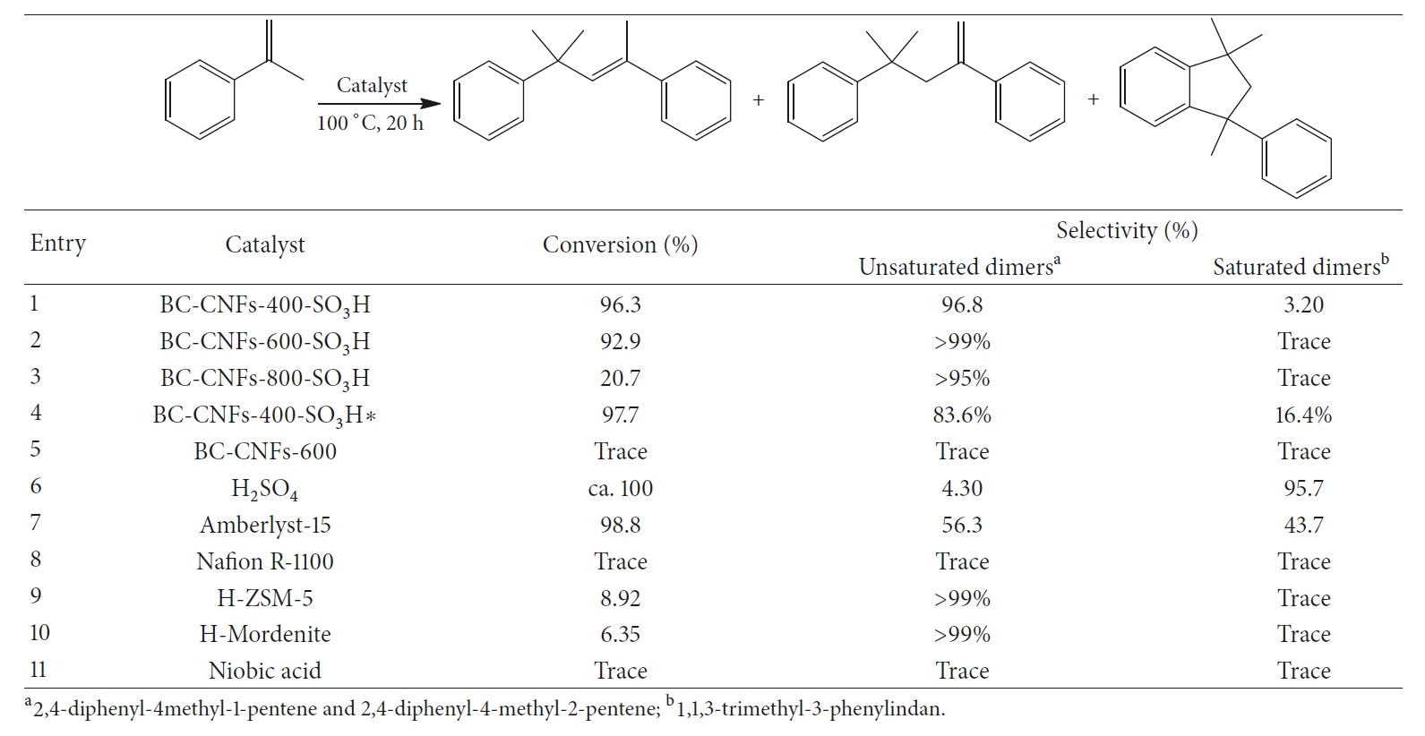 表1.纳米纤维素固体酸催化剂催化α-甲基苯乙烯二聚反应的性能和传统固体酸及液体酸性能的对比