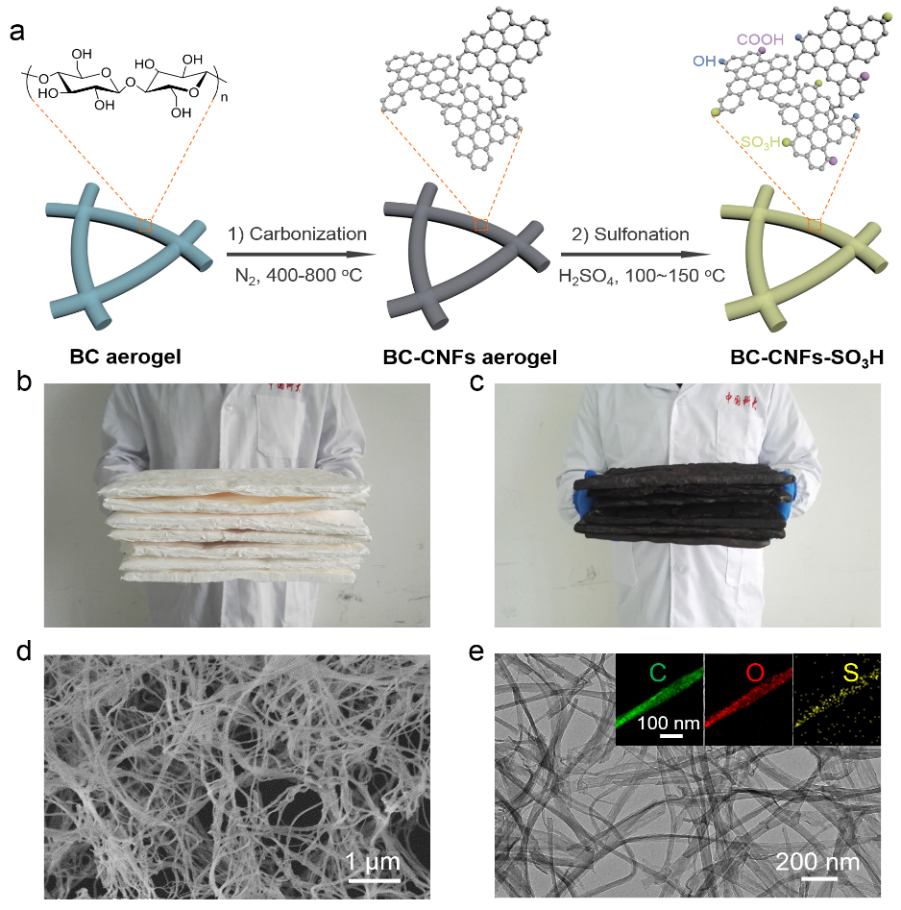图1. 纳米纤维SACs的制备及结构表征。(a)制备工艺示意图。(b)大规模制备的BC,和(c)BC-CNFS气凝胶。纳米纤维固体酸催化剂的(d)扫描电镜图像和(E)透射电镜图像及单个纤维的元素分布图像。