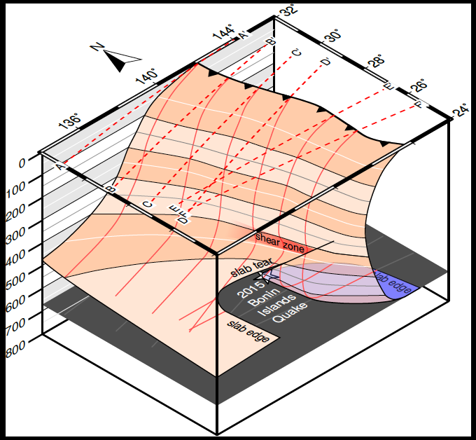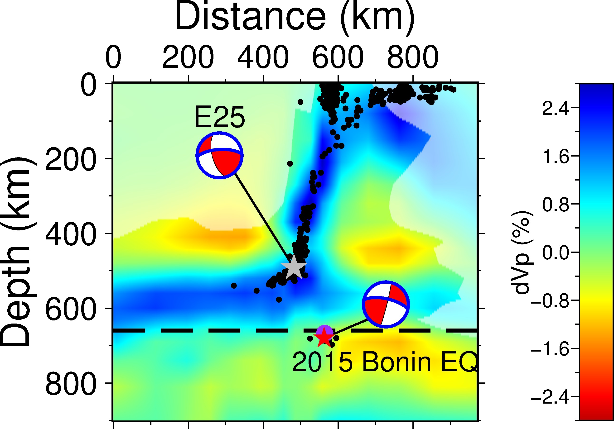 2015年在伊豆-小笠原俯冲带发生了深度达680公里震级为7.9的深源地震,而该地震发生在俯冲带无震区域,距离板片内地震带大约100公里之外的区域。本研究发现该地震发生在板片撕裂附近,并且位于反转板片内部较冷的部分,而不是前人研究所认为的位于板片内部较热的区域,符合目前深源地震产生的机制,帮助解决了这个深源地震的部分谜团。