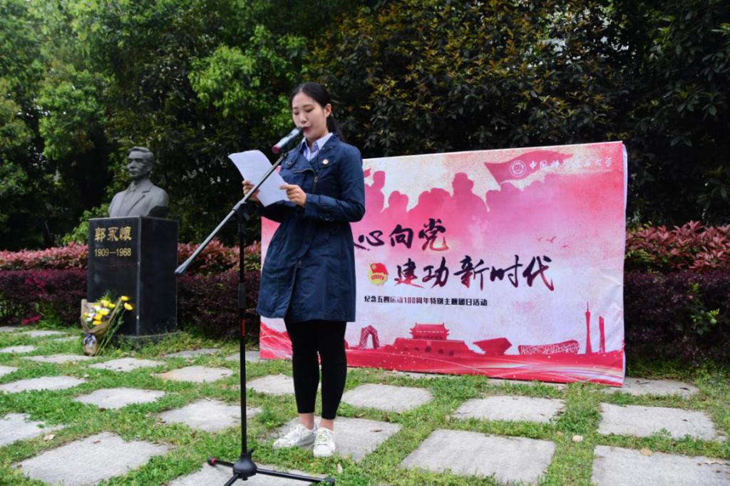 团员代表、化学物理系殷蓉蓉同学发言,她号召同学们在深切缅怀郭永怀和杨承宗先生的同时,更要学习他们不忘初心、报效祖国的爱国精神,求真务实、追求卓越的科学精神,呕心沥血、教书育人的奉献精神。