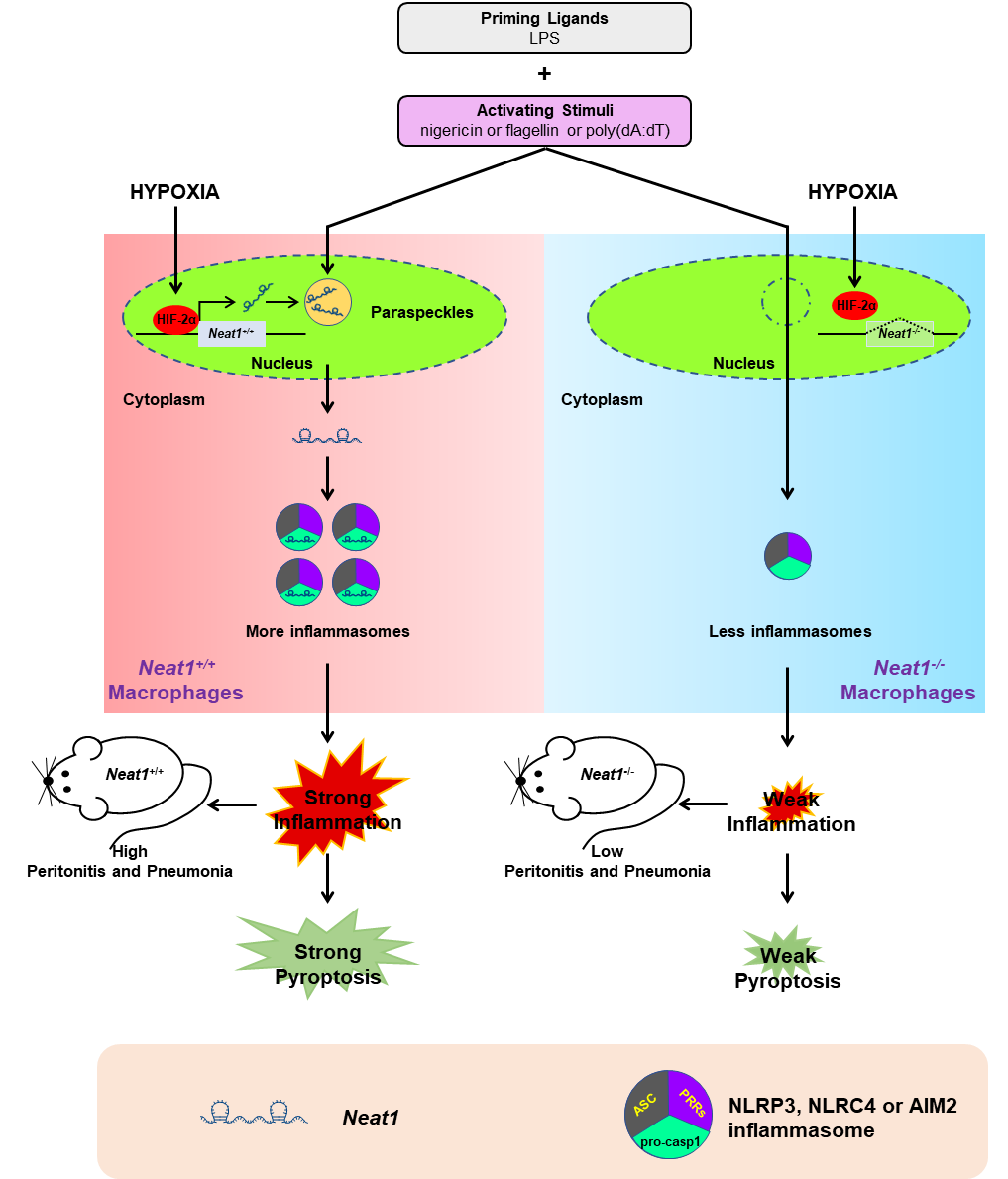 吴缅教授研究组发现受低氧诱导因子HIF-2α转录激活的lncRNA Neat1可以直接参与炎症小体的组装和激活,Neat1通过其5’端与caspase-1 p20亚基直接结合,既可以结合在pro-caspase-1上稳定炎症小体复合物的组装,也可以结合在成熟的caspase-1四聚体上增加其稳定性和酶活性。在巨噬细胞中,Neat1通过以上途径促进炎症小体的组装激活,增加成熟caspase-1四聚体的形成,从而上调促炎因子IL-1β和IL-18的成熟和分泌,并促进细胞焦亡。此外,在相关药物的诱导下,Neat1基因敲除小鼠较野生型小鼠表现出更低水平的腹膜炎和肺炎,进一步从体内证明了Neat1具有促进炎症反应的功能。