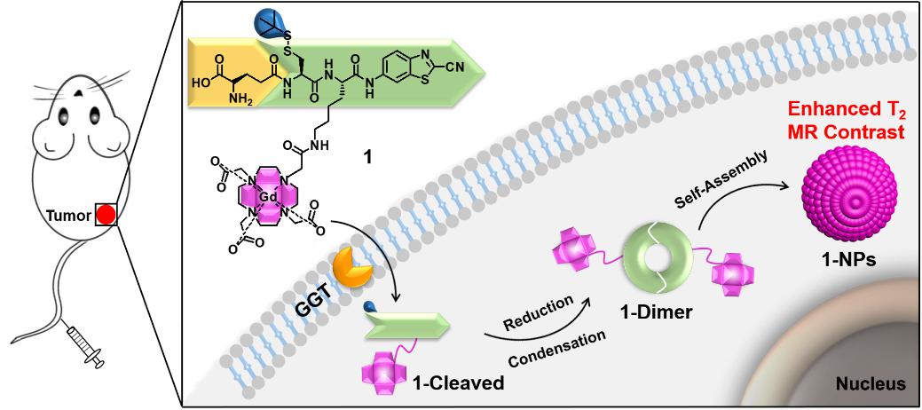γ-谷氨酰转肽酶普遍存在于哺乳动物细胞和细菌的膜上,参与内源性谷胱甘肽的代谢和细胞内半胱氨酸水平的平衡,在维持细胞的氧化还原平衡中发挥重要作用。此外,GGT可能通过调节细胞内的氧化还原代谢以促进肿瘤的发展、入侵和耐药。报道表明,许多恶性肿瘤如肝癌、宫颈癌、卵巢癌和乳腺癌中都有过度表达的GGT。作为一种重要的生物标志物,GGT的特异性检测可以用于癌症的早期诊断。磁共振成像(MRI)具有非侵入性、高穿透深度以及优良的空间分辨率,在深层肿瘤的诊断中有着独特的优势。但是,MRI的灵敏度很低,通常需要造影剂来增强正常组织与病理组织的成像对比度。钆造影剂在临床上用于软组织的纵向(T1)磁共振成像。有趣的是,梁高林课题组发现钆纳米结构在高强磁场下(9.4 T)可以用作一种新型T2磁共振造影剂。因此,他们在本工作中设计了一种可以在细胞内自组装形成纳米颗粒的钆小分子探针。该小分子探针在进入细胞的过程中被细胞膜上的GGT特异性剪切,然后在细胞内被谷胱甘肽还原,通过CBT-Cys点击缩合反应在细胞内自组装形成钆纳米颗粒(见下图)。他们与中科院强磁场科学中心钟凯研究员课题组合作,在9.4 T下小鼠肿瘤活体磁共振成像结果表明,相比于对照组,这种原位GGT特异性诱导的钆纳米颗粒显著增强了小鼠肿瘤的T2加权磁共振成像信号。这种新型的T2磁共振造影剂有望未来应用于临床上γ-谷氨酰转肽酶相关疾病(包括癌症)的诊断。