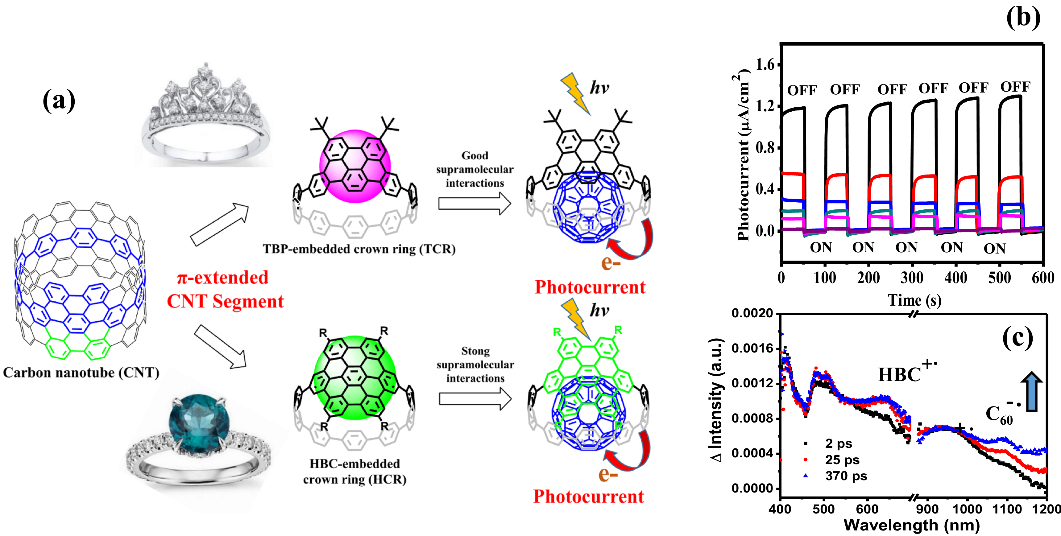 图2. (a)“分子皇冠”的结构及设计思想;(b)光电流;(c)瞬态光谱