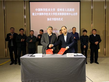 1月23日,党委常委、副校长朱长飞带队赴宿州调研,与宿州市人民政府举行中国科学技术大学技术转移宿州中心合作协议书签约仪式。宿州市政府副市长祖钧公等领导参加签约仪式,先进技术研究院、资产经营有限公司、科研部等部门负责人陪同参加相关活动。