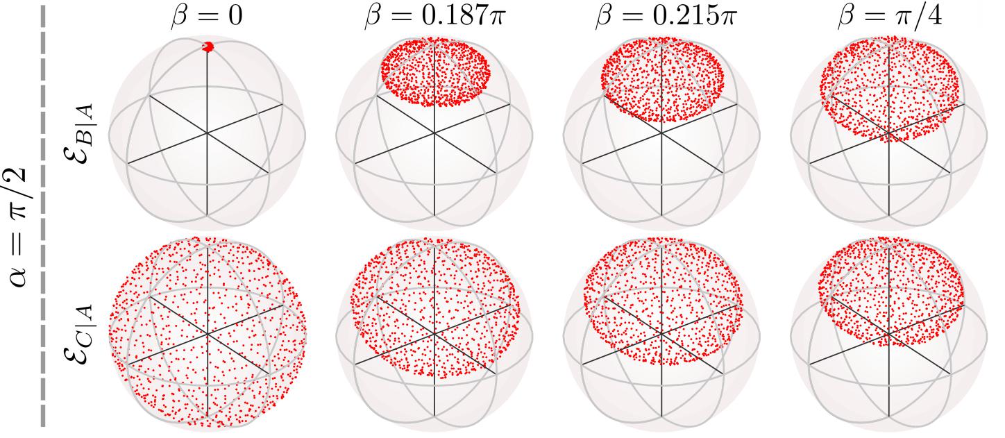 在共享的量子态不理想,或者多方共享量子态的情况下,Alice将不能将Bob的系统导引到任意的量子态上。此时Alice所能导引Bob的量子态的集合在Bloch表示下将构成一个椭球。我们知道单比特量子态可以可视化地表示为Bloch球中的一个矢量,而量子导引椭球则为两比特量子态提供了一个简单的可视化表示方法。在多方共享量子态的情况下,量子导引椭球具有体积单配性。例如Alice, Bob和Charlie共享一个三比特纠缠纯态,则Alice导引Bob和Alice导引Charlie的椭球体积存在一个简洁的单配关系,即改变参数使一个导引椭球的体积变大时,另一个导引椭球的体积则会变小。
